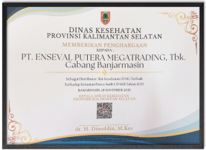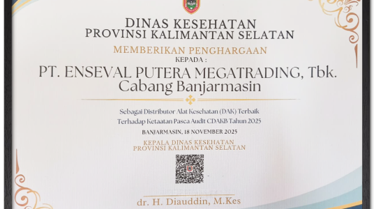 On Wednesday, November 19, 2025, PT Enseval Putera Megatrading Tbk's Banjarmasin Branch received the Best Medical Device Distributor (DAK) Award for Compliance with the 2025 CDAKB Audit from the South Kalimantan Provincial Health Office.