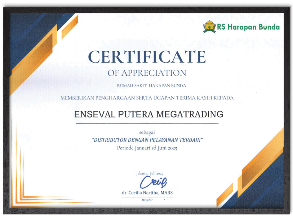 Enseval through Pejaten Branch Office (Jakarta 4) achieved award as Distributor with Best Service from Harapan Bunda Hospital Jakarta. This award is given in appreciation to Enseval for the overall consistency of service, starting from filling items by SKU to the speed of delivery.